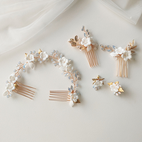Handmade Porcelain Flower Hair Comb Earring Pearl Headpiece Hair Jewelry for Bride Wedding Women Party Prom